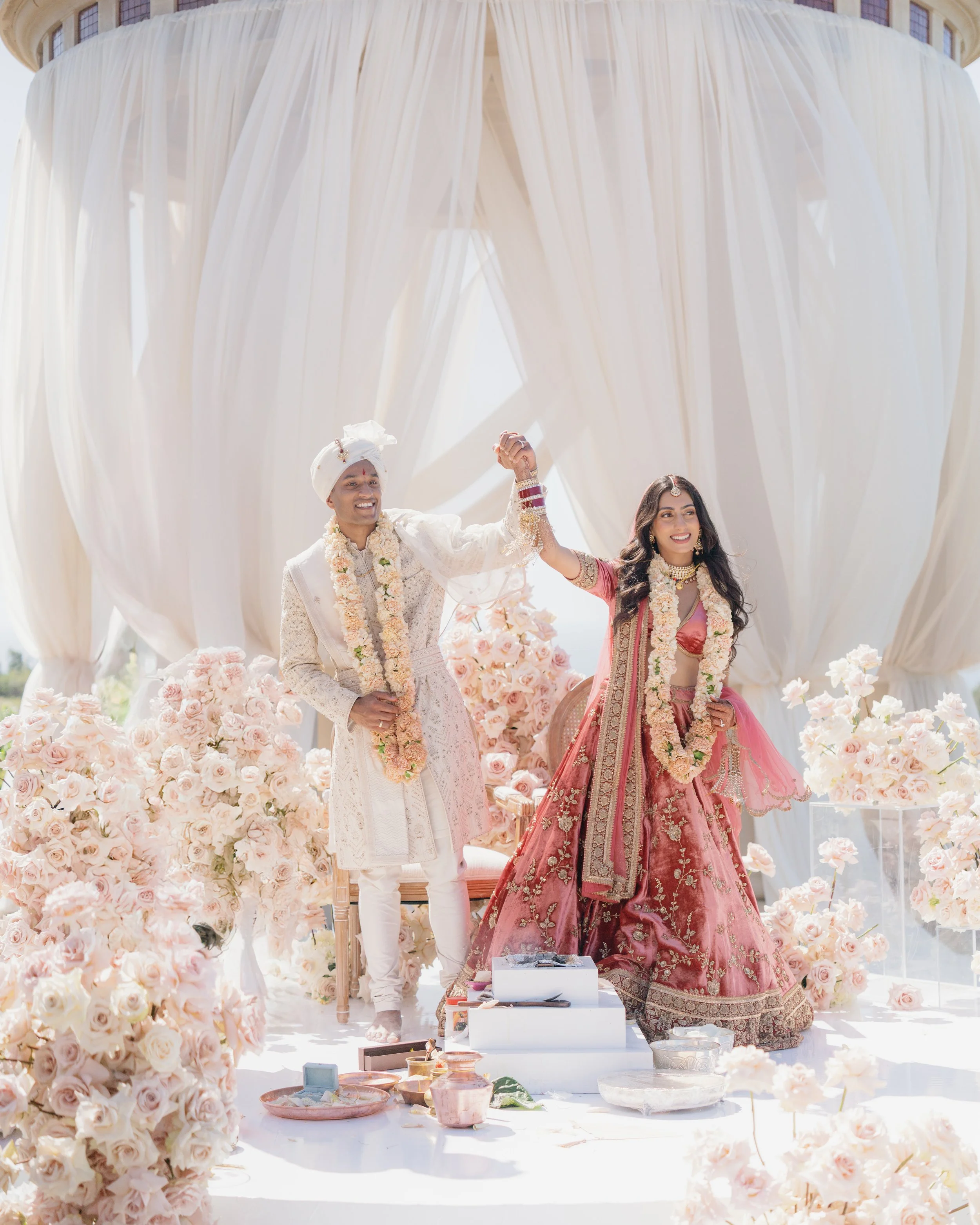 Simran and Suraj’s love story began quietly in college, in the in-between moments of late-night conversations and an unspoken closeness that followed them from the Midwest to opposite coasts, and eventually into a shared life in Seattle. In August 2024, Suraj proposed on the shores of Lake Como after a day of rain and missed trains, an almost cinematic prelude that proved the most imperfect days can yield the most perfect memories. Their Newport Beach wedding unfolded in thoughtful contrast: a Haldi that blended tradition with playful modernity, a Sangeet that became an evening of storytelling through dance and performance, and a ceremony that paired a soft, contemporary aesthetic with Telugu and Punjabi Hindu rituals. The weekend concluded with a reception that married Hollywood elegance with Bollywood warmth, but it was the sense of togetherness—friends and family from every chapter gathered as one—that gave the celebration its enduring, unmistakably personal glow.
